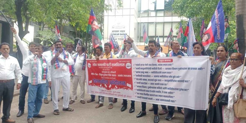 पुणे, 05/06/2025: लोकजनशक्ति पार्टी रामविलासच्या कार्यकर्त्यांनी आज पुण्यातील आयकर विभागाच्या गुलटेकडी येथील कार्यालयासमोर जोरदार आंदोलन केले. पक्षाने इन्कम टॅक्स इनफॉर्मेंट्स रिवॉर्ड स्कीम २०१८ अंतर्गत इन्फॉर्मंट कोड मिळविण्याच्या मागणीकडे प्रशासनाच्या दुर्लक्षाचा निषेध केला.पक्षाचे पुणे जिल्हा अध्यक्ष संजय अल्हाट यांनी सांगितले की,’आम्ही आयकर चुकवणाऱ्या व्यक्ती आणि कंपन्यांची विश्वसनीय माहिती दिली असूनही प्रशासन त्वरित कारवाई करत नाही,त्यामुळे आम्ही आंदोलनाचा मार्ग स्वीकारला आहे. जर मागण्या पूर्ण झाल्या नाहीत, तर दिल्लीतील जंतर-मंतरवर मोठ्या प्रमाणात आंदोलन केले जाईल’.