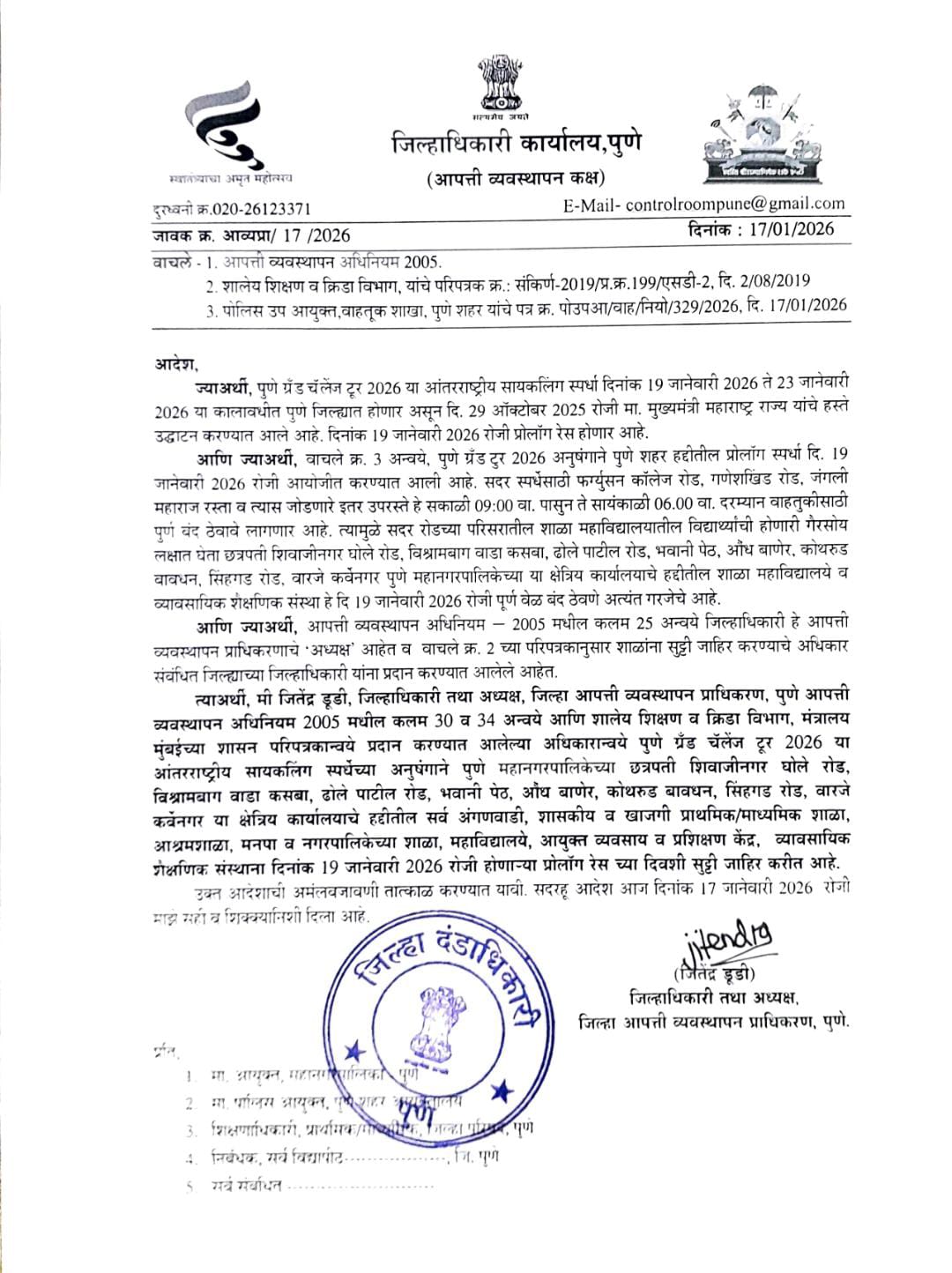 पुणे, दि. १७ जानेवारी २०२६: पुणे शहरात १९ ते २३ जानेवारी २०२६ या कालावधीत आयोजित करण्यात येणाऱ्या आंतरराष्ट्रीय सायकलिंग स्पर्धा ‘पुणे ग्रँड चॅलेंज टूर २०२६’ च्या पार्श्वभूमीवर, सोमवार दि. १९ जानेवारी २०२६ रोजी शहरातील प्रमुख भागांतील शाळा, महाविद्यालये व शैक्षणिक संस्थांना सुट्टी जाहीर करण्यात आली आहे. जिल्हाधिकारी तथा जिल्हा आपत्ती व्यवस्थापन प्राधिकरणाचे अध्यक्ष जितेंद्र डुडी यांनी यासंदर्भातील अधिकृत आदेश निर्गमित केले आहेत.