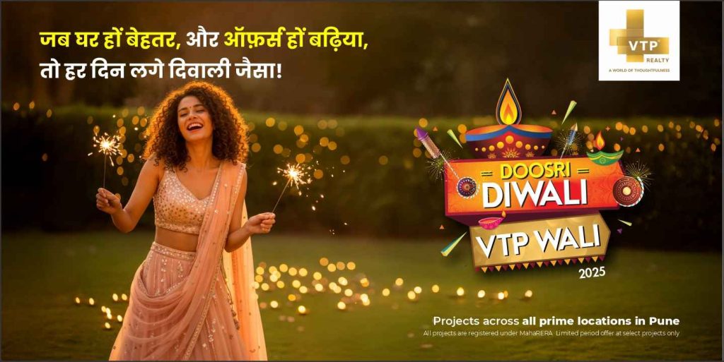 पुणे, १३ नोव्हेंबर २०२५: पुण्याचा सर्वात आवडता रिअल इस्टेट उत्सव पुन्हा एकदा भव्यदिव्य सोहळ्यामय स्वरूपात परतला आहे. दिवाळीचा उत्साह पुढे नेत, व्हीटीपी रियल्टीने “दुसरी दिवाली व्हीटीपी वाली २०२५” ची अभिमानाने सुरुवात केली आहे. हा अनोखा उत्सव, प्रत्येक गृहखरेदीदारासाठी आनंद, उत्सुकतेसह अनेक फायदे आणि सवलती घेऊन येतो. या वर्षीचा उत्सव दुहेरी आनंद, दुहेरी लक्झरी आणि पुण्यातील सर्वात प्राईम ठिकाणी एकापेक्षा एक खास ऑफर्स घेऊन आला आहे.